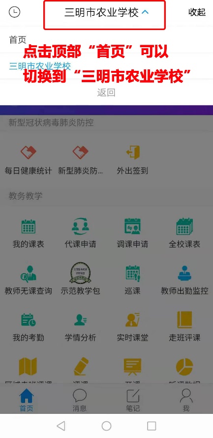 方法二:在“学习通”APP首页,点击顶部“首页”可切换到“三明市农业学校”首页。点击“每日健康统计”,填写完成提交即可。