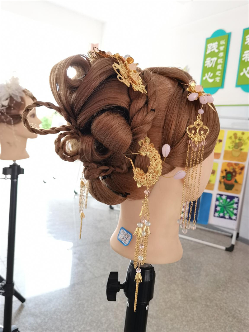 同日,“新娘盘发”项目技能赛校赛在尚美楼一楼开赛。经过激烈的角逐,19级美发与形象设计的蓝珊珊摘得本次桂冠。她的作品作为比赛成果参与职教周的展示。在比赛过程中,一年级学生在现场观摩,她们以这样不同以往的方式进行发型的学习。比赛结束后,专业老师对比赛进行了复盘点评,这使学生们再次对盘发技艺有了更高更深的理解。同时也更能明白“台上一分钟,台下十年功”的成功法则。