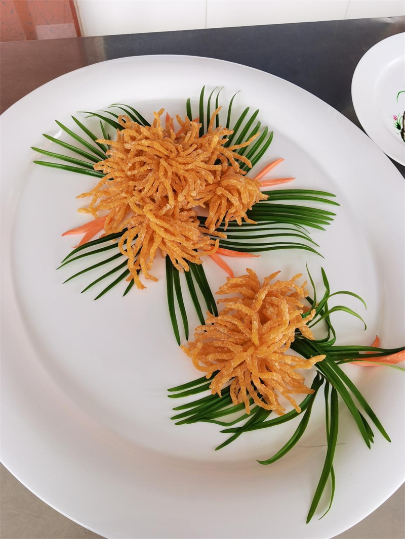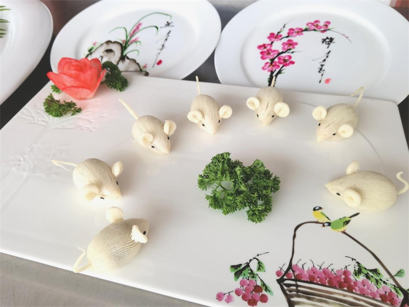 烹饪专业的学生分别展示了雕刻、热菜、面点制作以及画盘技术。其中,雕刻作品《孔雀迎宾》雍容大气,白萝卜摇身一变成为华丽孔雀与娇艳欲滴的花朵,胡萝卜雕刻成的小鸟在“绿草丛”中欢快鸣唱。热菜作品《花开富贵》虽已展示多时,依旧香气扑鼻。裹粉炸制的《菊花鸡脯》黄得似金,均匀的线条展示着学生们精湛的技艺和纯熟的刀功。面点油酥点心《鼠(数)你最棒》制作的栩栩如生,七只小老鼠活似乎就灵活现的在我们眼前活动。