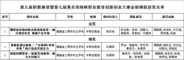 第九届福建省“互联网+”大学生创新创业大赛职教赛道暨第七届黄炎培海峡职业教育创新创业大赛落下帷幕。根据福建省教育厅《关于第九届中国国际“互联网+”大学生创新创业大赛福建省赛拟获奖名单的公示》,我校在本次比赛中获得1金2铜,所有参赛项目全部获奖,获奖数量再创新高。