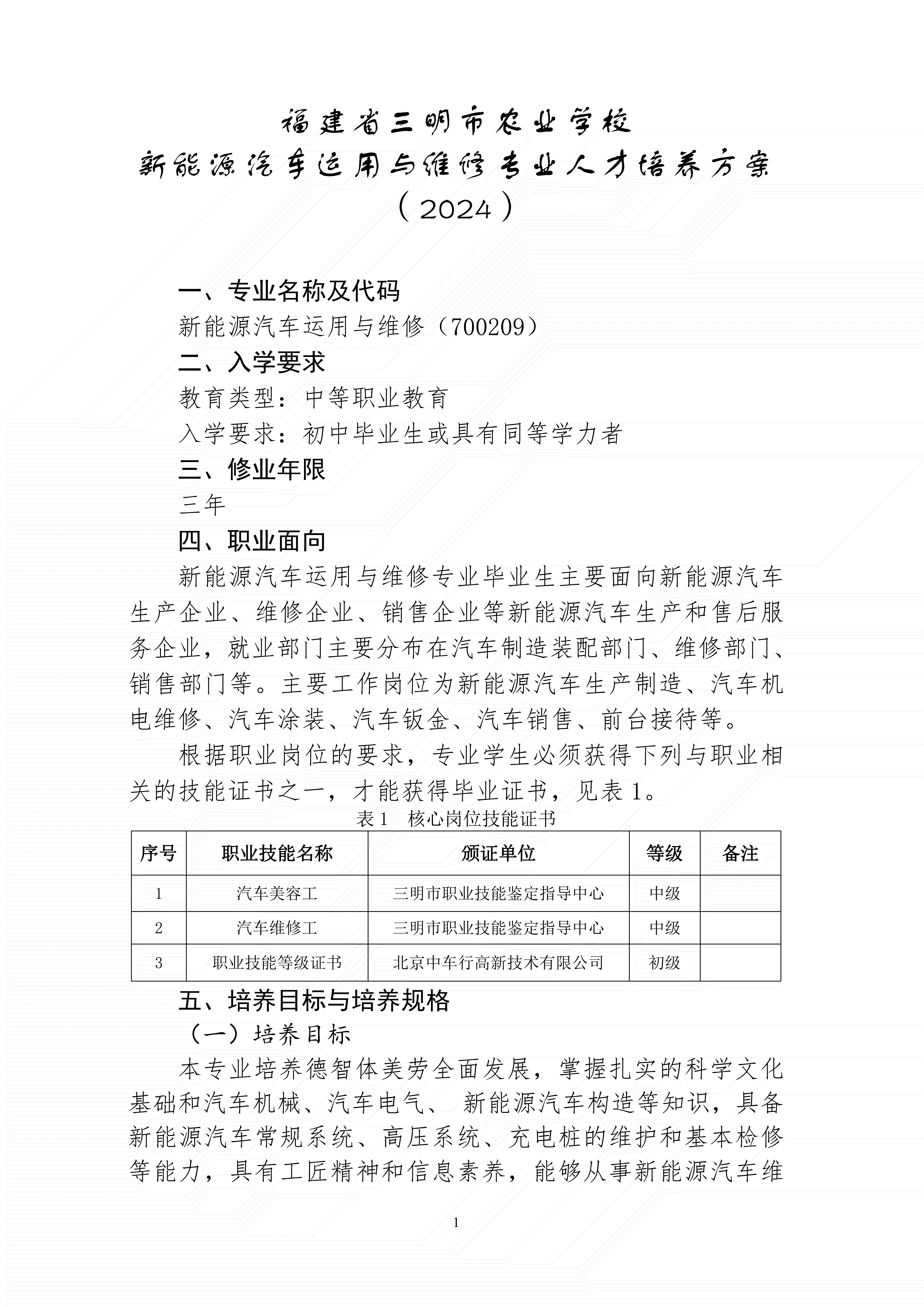 三明市农业学校新能源汽车运用与维修专业人才培养方案(2024)