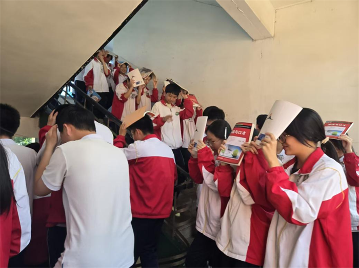 5月14日,学校开展防震应急疏散演练。第一阶段地震警报响起后,学生在班级原地避险,在老师的引导下,迅速抱头蹲下,用书本或其他物品保护头部。待第二阶段地震疏散警报响起,广播播出:“马上有秩序地撤离”,各班按防震减灾应急避险的疏散线路迅速撤离,引导学生弯腰、护头,沿着逃生路线快速、有序地撤离,在操场的指定位置集结。