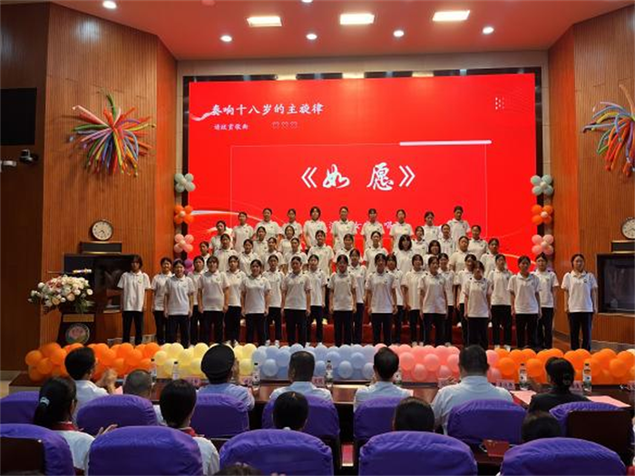 随后,22电气化自动化五年专班黄浩楠同学作为学生代表上台发言。他深情回顾十八载成长历程,感悟青少年的责任与担当。他说,十八岁是青春最美的礼赞,中职学子应做“眼中有光”的追梦者,将个人理想融入民族复兴;做“脚下有路”的实干家,以工匠精神践行技能报国;做“肩上有责”的传承者,以青春“小我”书写强国“大我”,不负青春使命。